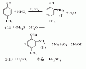 1.以對甲苯酚為原料,以硝酸、硫酸配制一定濃度的混酸進行硝化,反應畢,分離廢酸,經(jīng)洗滌蒸餾后以硫化堿還原,后經(jīng)酸析、結晶、干燥得成品。