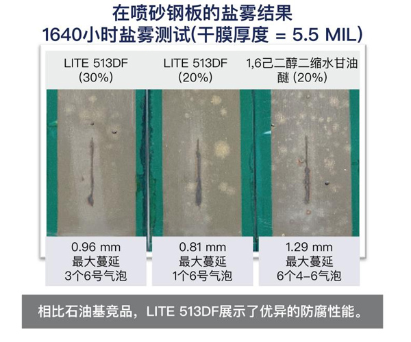 LITE 513DF是一款基于腰果殼油的新型高生物含量稀釋劑,它的環(huán)氧當(dāng)量比標(biāo)準(zhǔn)的513型號要低。這款產(chǎn)品適用于環(huán)氧涂料、單組分和雙組分粘合劑以及復(fù)合材料。LITE 513DF粘度低,具有優(yōu)異的稀釋能力,與雙酚A型液體環(huán)氧樹脂的添加重量曲線如圖所示。作為稀釋劑,它在環(huán)境溫度和低溫下具有良好的硬度發(fā)展。與其他腰果殼油改性的材料類似,LITE 513DF具有良好的耐水性和柔韌性。在涂料應(yīng)用中,LITE 513DF在長期鹽霧試驗(yàn)中表現(xiàn)出非常好的防腐性能,請見本頁面板的圖片。在粘合劑應(yīng)用中,這種環(huán)氧稀釋劑還可作為改性劑,提高伸長率和粘結(jié)強(qiáng)度,同時(shí)將對Tg和抗拉強(qiáng)度的影響降至低。