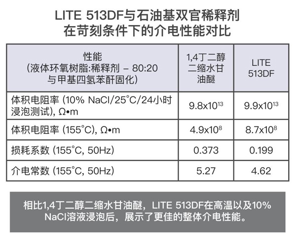 根據(jù)IEC 62631和IEC 60243標(biāo)準(zhǔn)進(jìn)行測試,如其介電性能所示,LITE 513DF提供了良好的絕緣性能。在Epon 828的配方中,樹脂的使用量為20%,用MTHPA(甲基四氫鄰苯二甲酸酐)固化,并用BDMA(芐基二甲胺)催化。LITE 513DF展示了優(yōu)異的結(jié)果,其體積電阻率和介電強(qiáng)度更高,損耗因數(shù)和介電常數(shù)比競品1,4丁二醇二縮水甘油醚更低。當(dāng)兩種稀釋環(huán)氧樹脂體系都暴露于高溫或鹽溶液中時(shí),LITE 513DF的性能優(yōu)于石油基雙官能稀釋劑。LITE 513DF是一款良好的環(huán)氧稀釋劑和改性劑,適用于電氣灌封、鑄造和封裝(浸漬樹脂)。