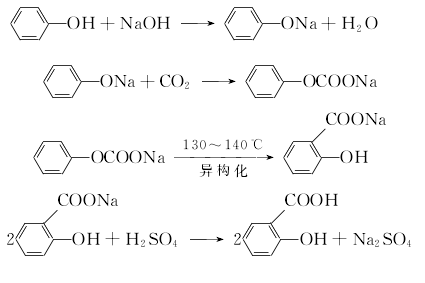 將苯酚用50%液堿中和,真空干燥,然后將釜溫冷卻至100℃,慢慢通入干燥的二氧化碳,當(dāng)釜內(nèi)壓力達(dá)0.7-0.8Mpa時(shí),停止通二氧化碳,此時(shí)生成碳酸苯酚酯鈉,然后在130-140℃下發(fā)生分子內(nèi)重排異構(gòu)化,變?yōu)樗畻铘肉c,再用硫酸酸化,得水楊酸粗品。將粗品在減壓下升華,即得水楊酸精品,含量99%,收率達(dá)98%以上。消耗定額(kg/t):苯酚(98%)704,燒堿(95%)417,硫酸(95%)500,二氧化碳(99%)467。 (3)制法 苯酚與氫氧化鈉反應(yīng)生成酚鈉鹽,然后再與二氧化碳合成鄰羥基苯甲酸鈉,經(jīng)酸化制得水楊酸:
