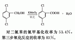 2.氯甲基化法由對(duì)二氯苯與多聚甲醛作用,再經(jīng)高錳酸鉀氧化而得。對(duì)二氯苯的氯甲基化收率為53.4%,第三步氧化反應(yīng)的收率為83%